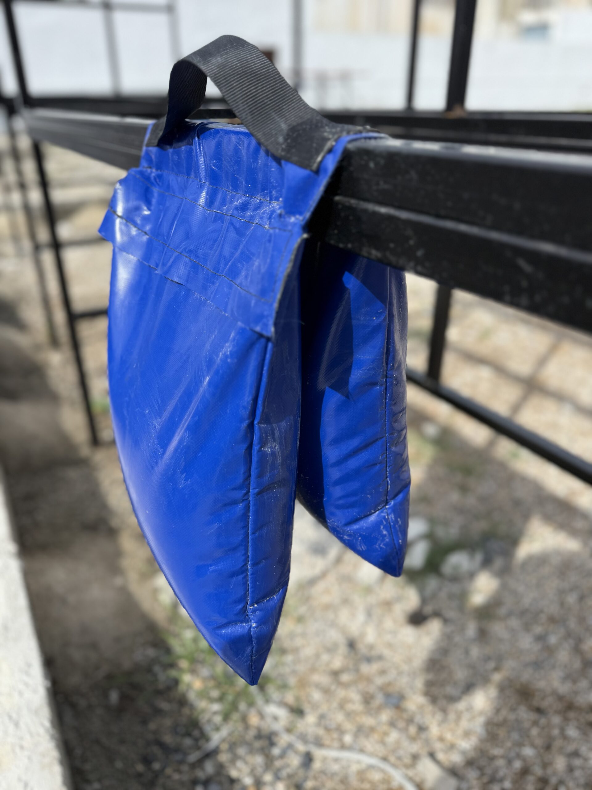 Sac de lestage à mettre à cheval sur les barreaux d’une échelle, escabeaux et échafaudage, composé de deux poches pour une répartition du poids de lest.